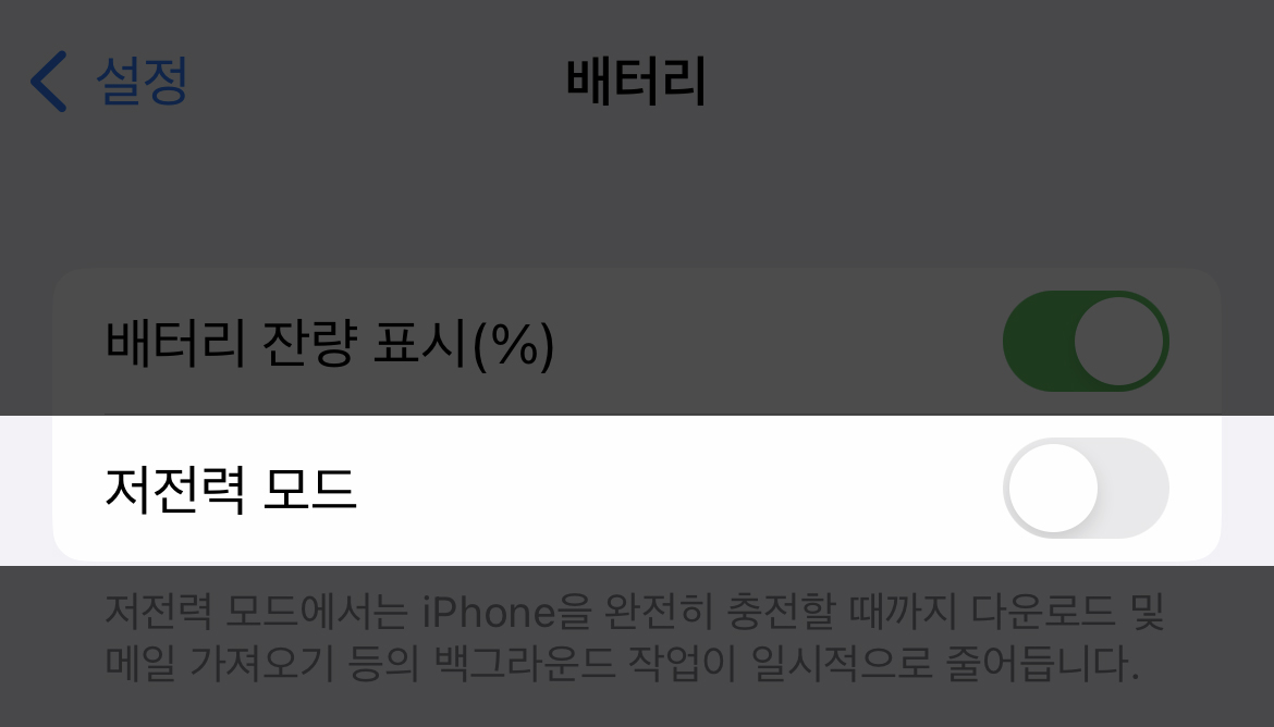 [설정] - [배터리] - 저전력 모드가 활성화되어 있다면 화면 녹화를 저장하지 못했다는 메세지가 표시될 수 있으므로 저전력 모드를 비활성화합니다.