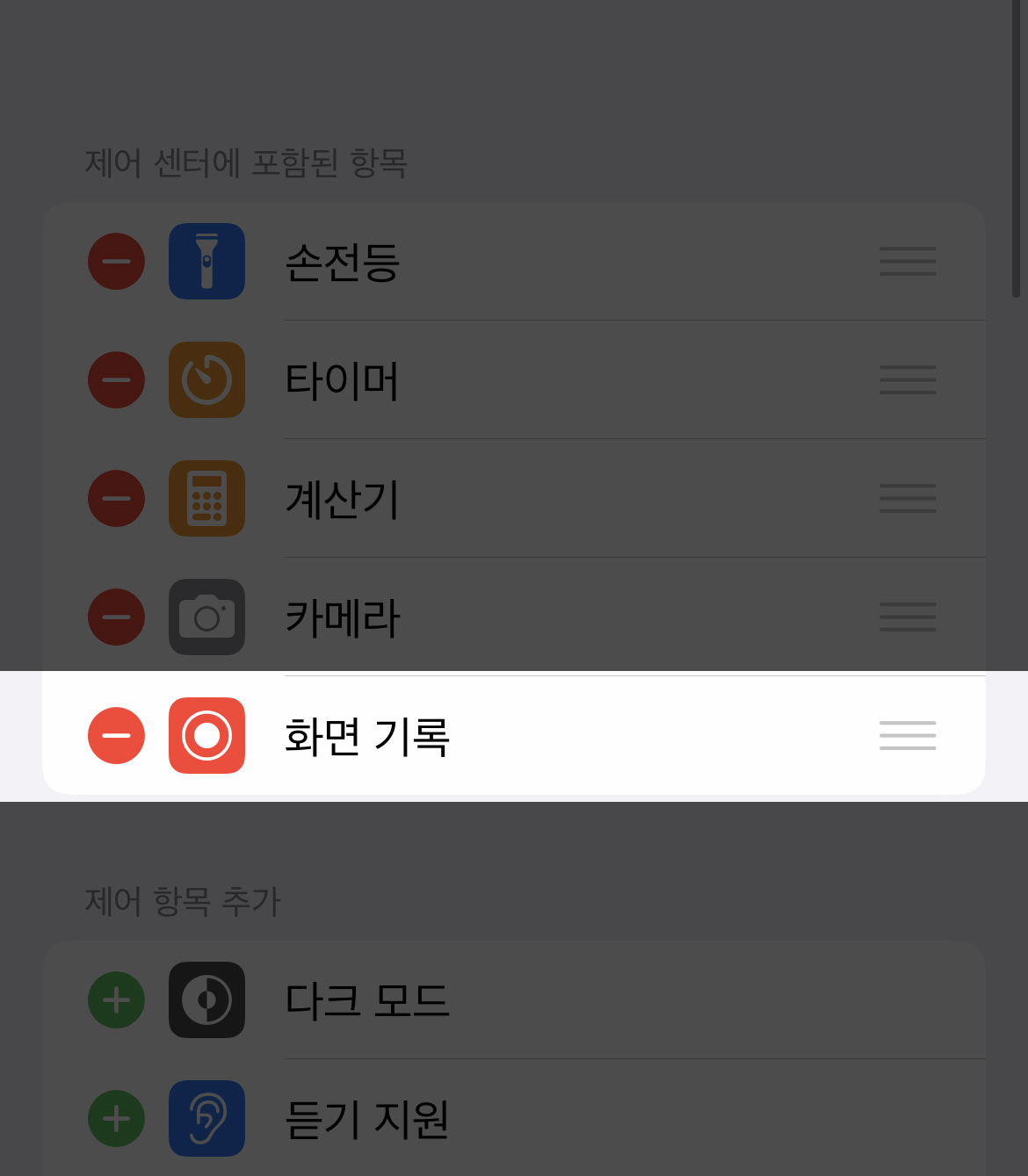 기본 제어 센터에 포함된 항목은 손전등, 타이머, 계산기, 카메라가 보여지고 아래 제어 항목 추가 부분에 표시할 제어 항목을 (+)추가하고 (-) 제거하여 사용자에 맞는 설정을 변경할 수 있으며 우측의 三 버튼을 드래그 앤 드롭하여 사용자에 맞는 순서도 변경할 수 있습니다. 제어 센터에 들어왔다면 아래 부분으로 스크롤하여 내리면 (+) 화면 기록이라는 항목을 쉽게 찾을 수 있습니다. 추가한 항목을 제거하려면 (-)을 눌러주면 제거됩니다.